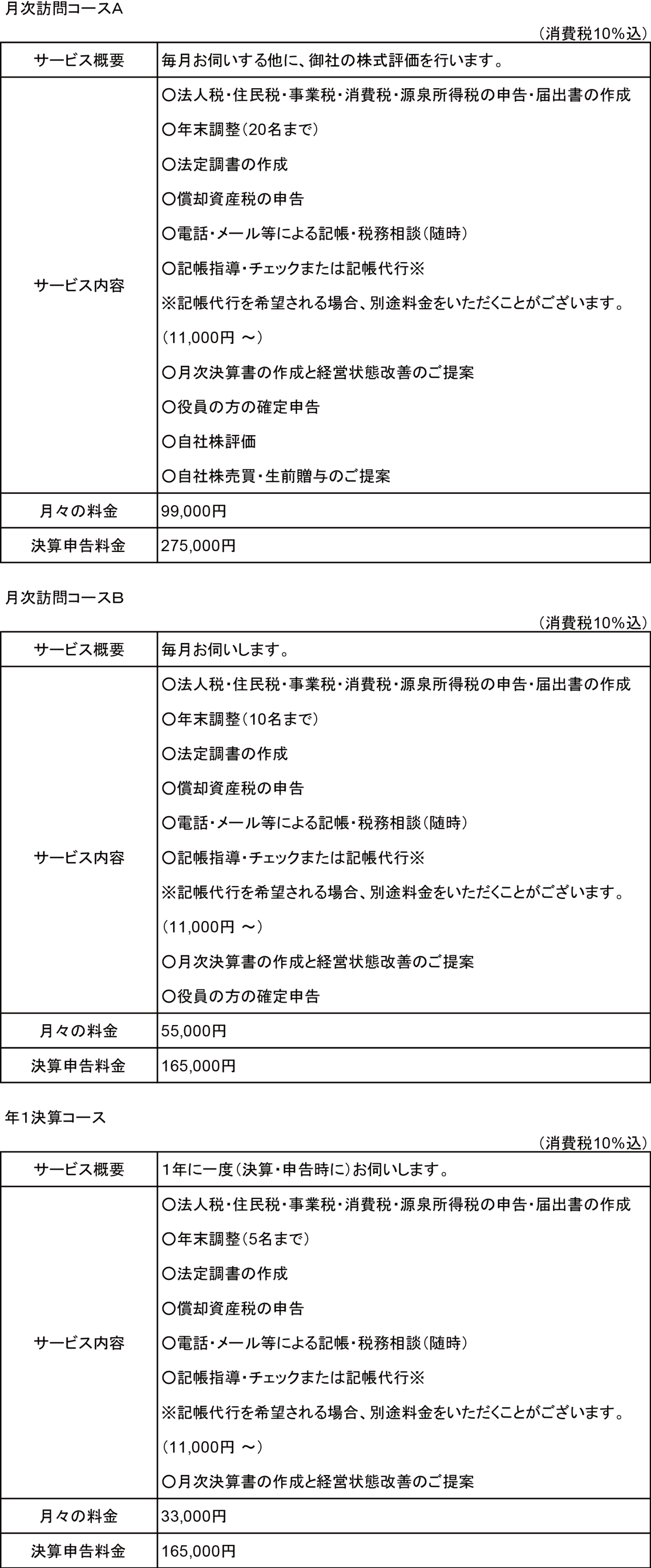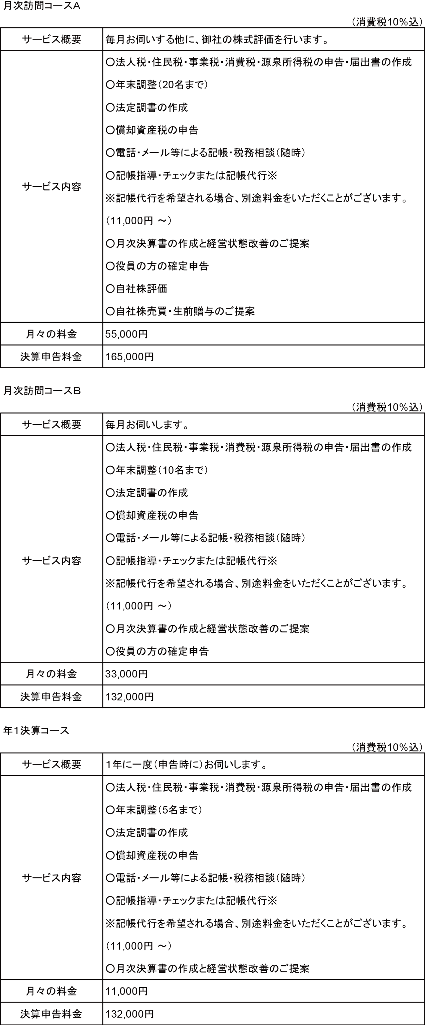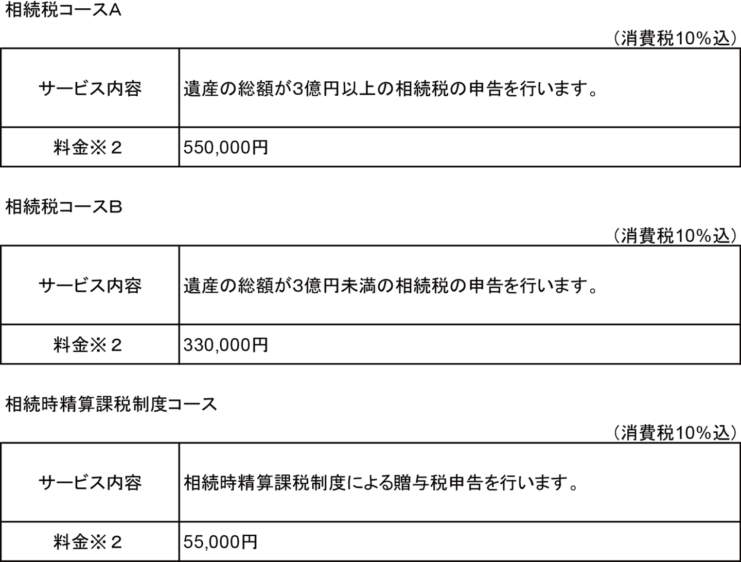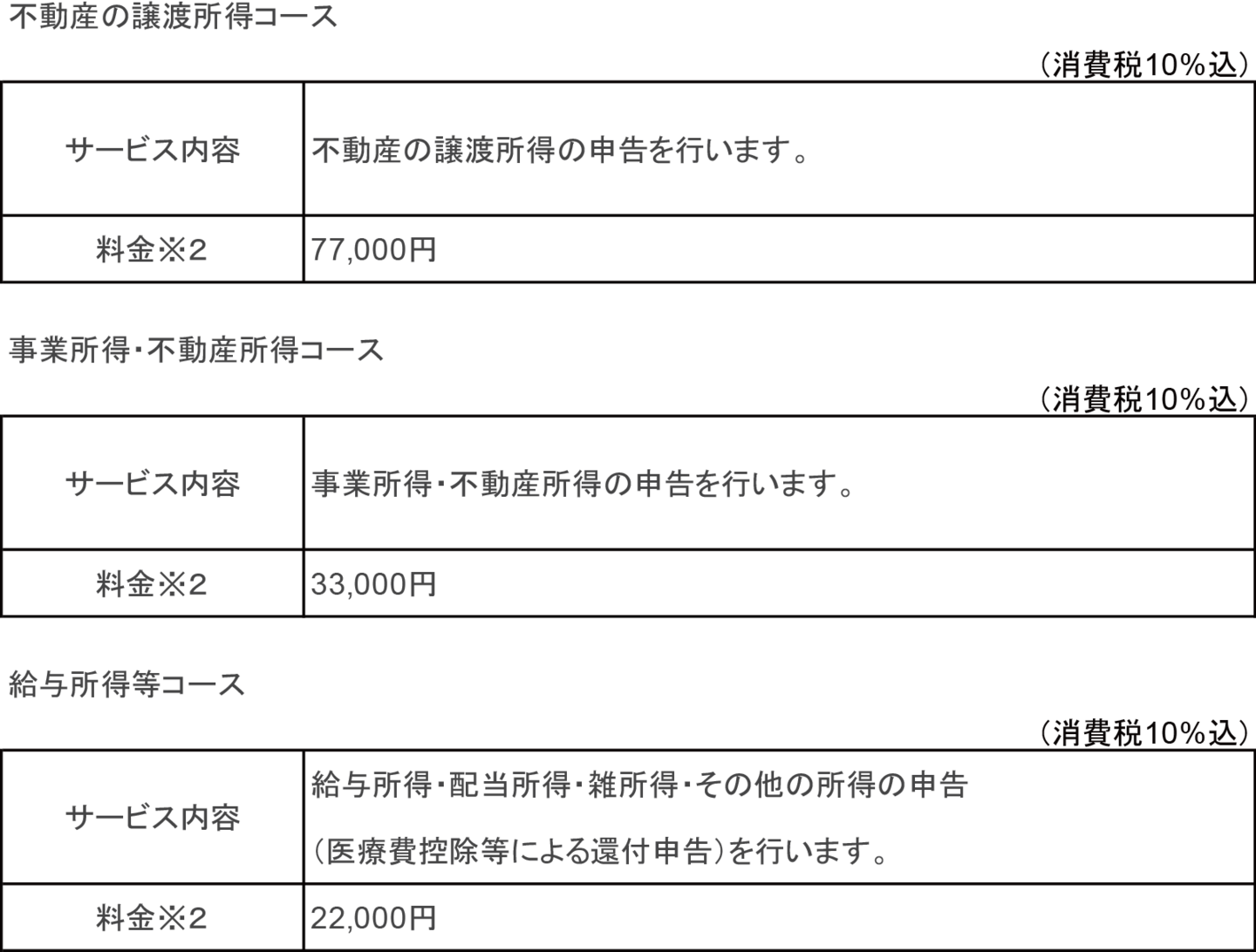 【1】年間売上高が3億円未満のお客様 【2】年間売上高が3億円以上のお客様 【1】確定申告のお客様 【2】相続税・贈与税申告のお客様 (消費税込)※1 所得の組み合わせは一例です。 これ以外の組み合わせにつきましては、お見積りさせていただきます。※2 申告の内容、分量等により、お見積りさせていただきます。